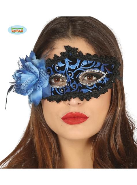 Antifaz veneciano negro y azul con flor para mujer