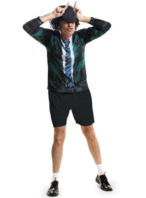 Incluye una camiseta que imita la vestimenta del guitarrista de ACDC Angus Young, con una chaqueta verde botella, una corbata a rayas azules y amarillas y una camisa blanca impresas.