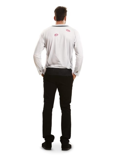 Incluye una camiseta que tiene impresa una camisa blanca con pajarita negra abierta dejando al descubierto un pecho musculado con marcas de labios rojos.